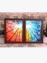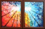 This vibrant diptych captures a worm’s-eye view of a forest, looking straight up toward a bright, central light. The artist uses a pointillist style, building the foliage with thick, colourful dots.