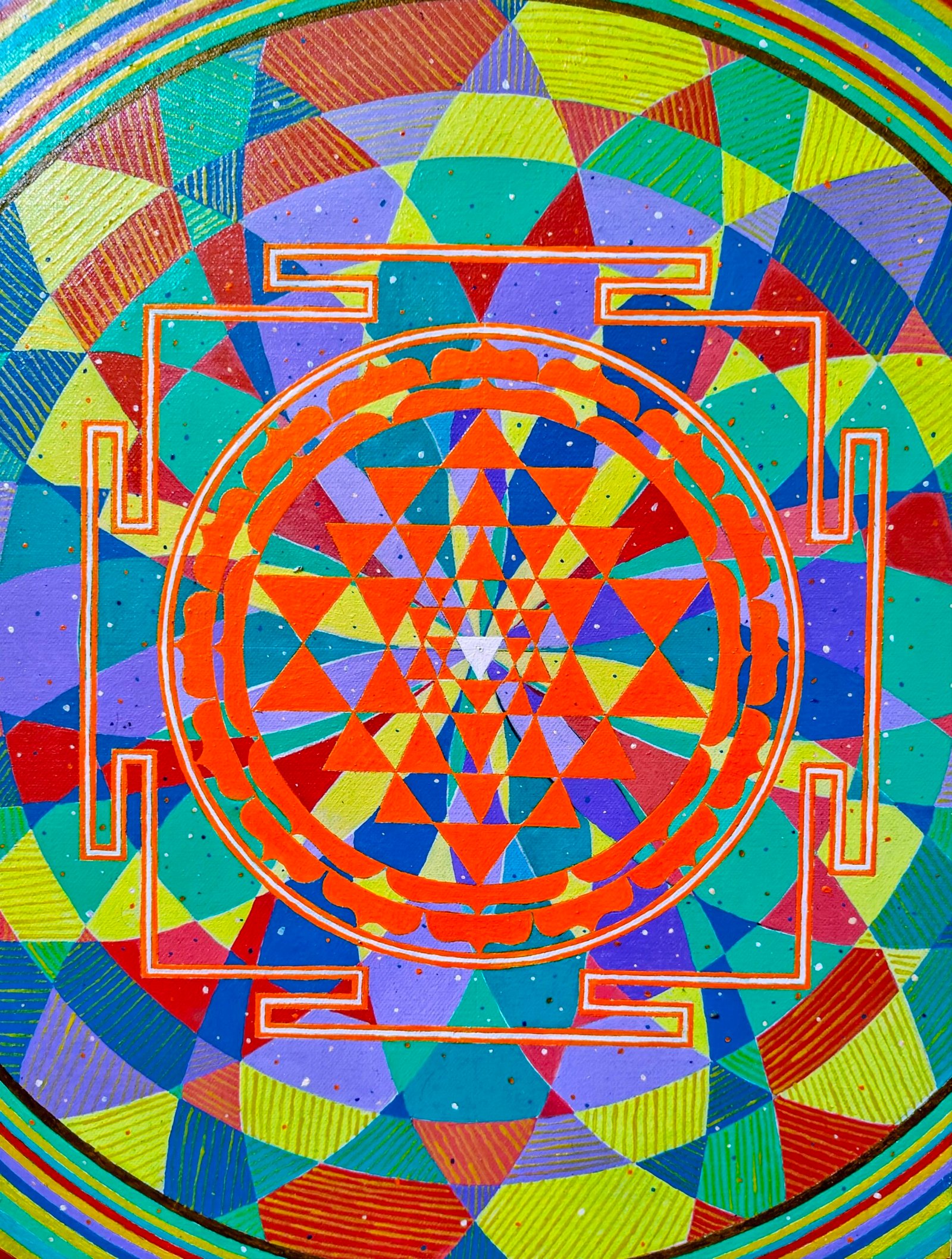 The oil on canvas, chosen for its ability to hold vivid colours and fine details. The subject mandala or yantra reflects a focus on spirituality or inner exploration. The geometric, abstract style was likely selected to engage viewers with its complexity and universal appeal.